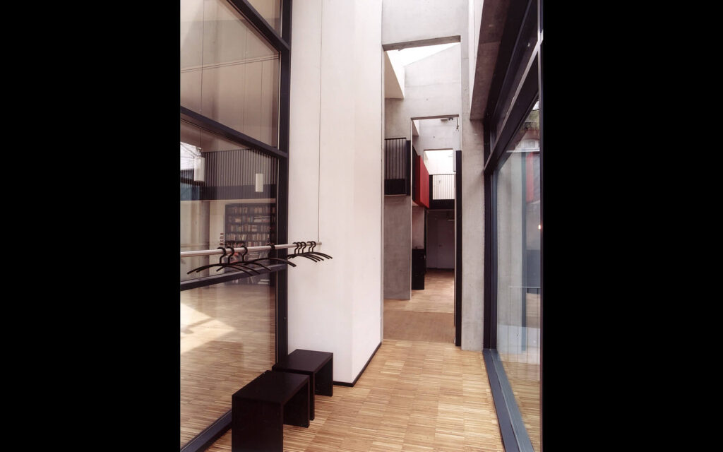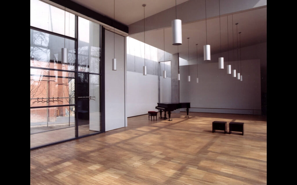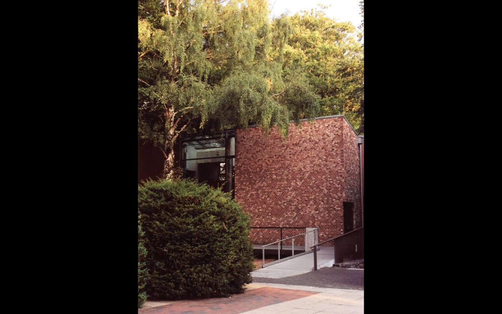 Das Gemeindehaus steht im Kontext eines Backstein-Ensembles aus neugotischem Kirchengebäude und zwei Pastoraten. In seiner Materialität ordnet es sich dem Ort unter, in seiner Gestalt ist es ein eindeutiges Zeugnis der Gegenwart. Auf einem Rechteckgrundriss sind diverse Raumzonen klar und funktional angeordnet. Differenziertes Licht, z.T. indirekt über Obergaden geführt, prägt den Raumeindruck. Die in großen Teilen geöffnete Fassade bezieht den Außenraum in das Gebäudeinnere ein.