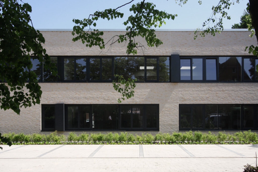 Der Entwurf entwickelt die Neubauten (1.BA: Klassentrakt im Westen, 2.BA: Mensa im Osten) zusammen mit Mauereinfriedungen als Rahmen für den Baubestand. Dahinter steht der Gedanke, die sehr heterogenen Einzelelemente in einen ordnenden Zusammenhang zu bringen. Der Schwerpunkt des Schulcampus wird nach Westen verlagert. Gegenüber der vorbeiführenden Straße bildet der neue Klassentrakt zusammen mit dem Schulvorsteherhaus und dem Platz davor die Adresse der Anlage.