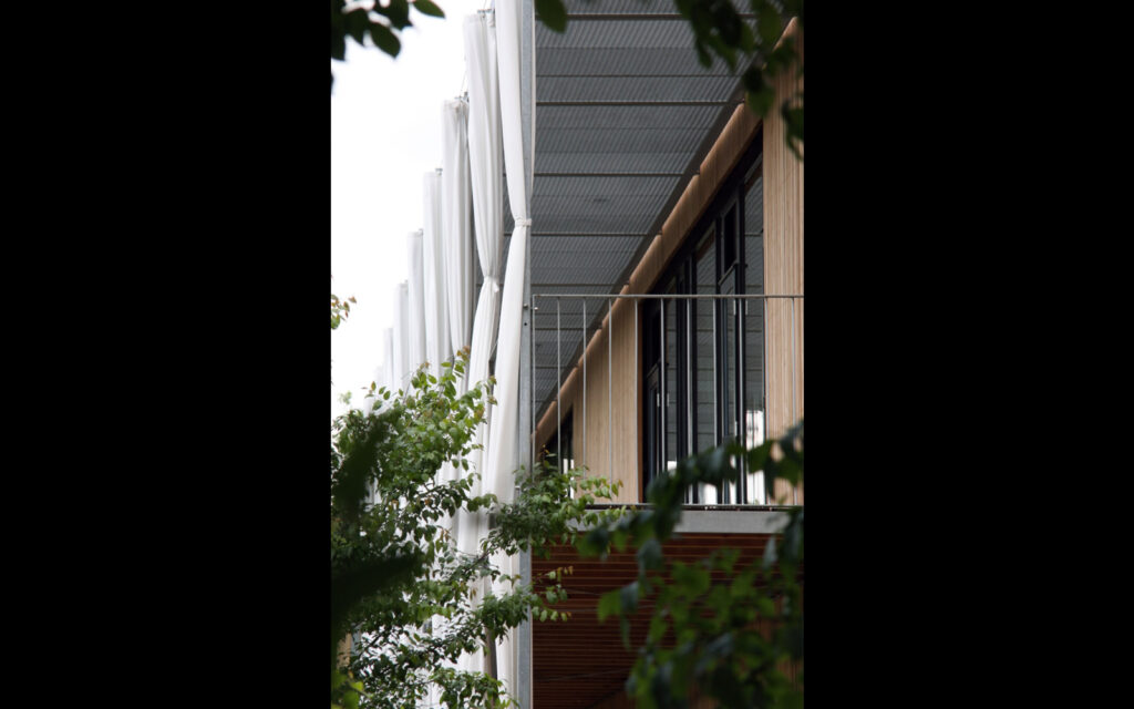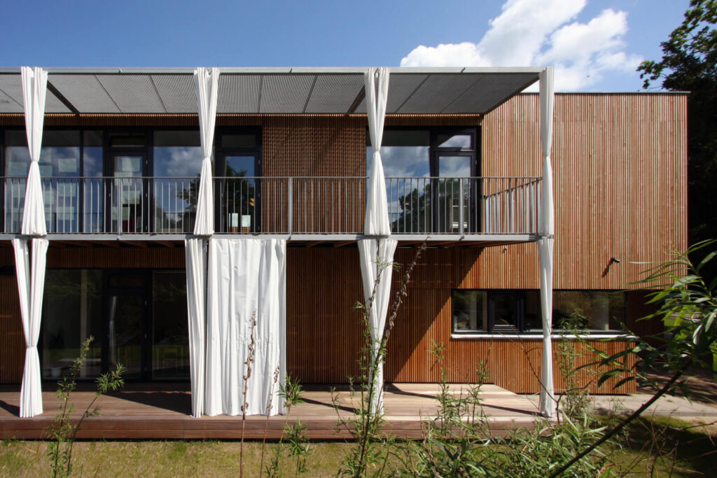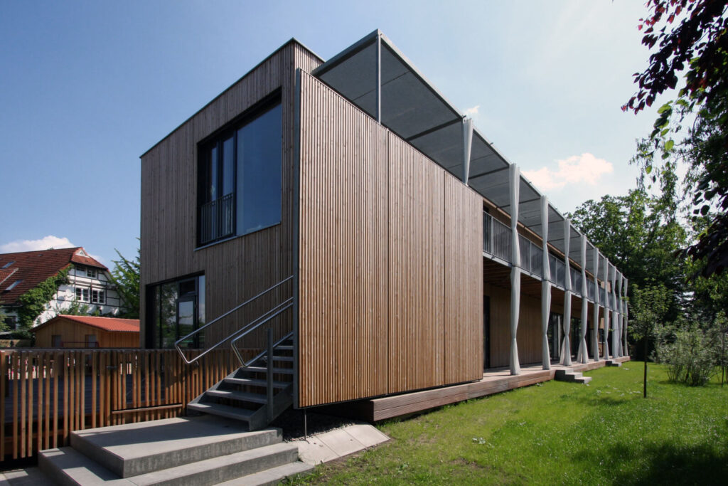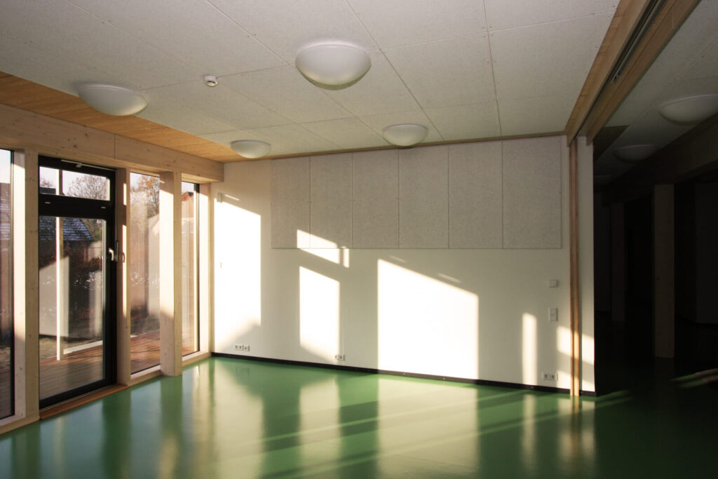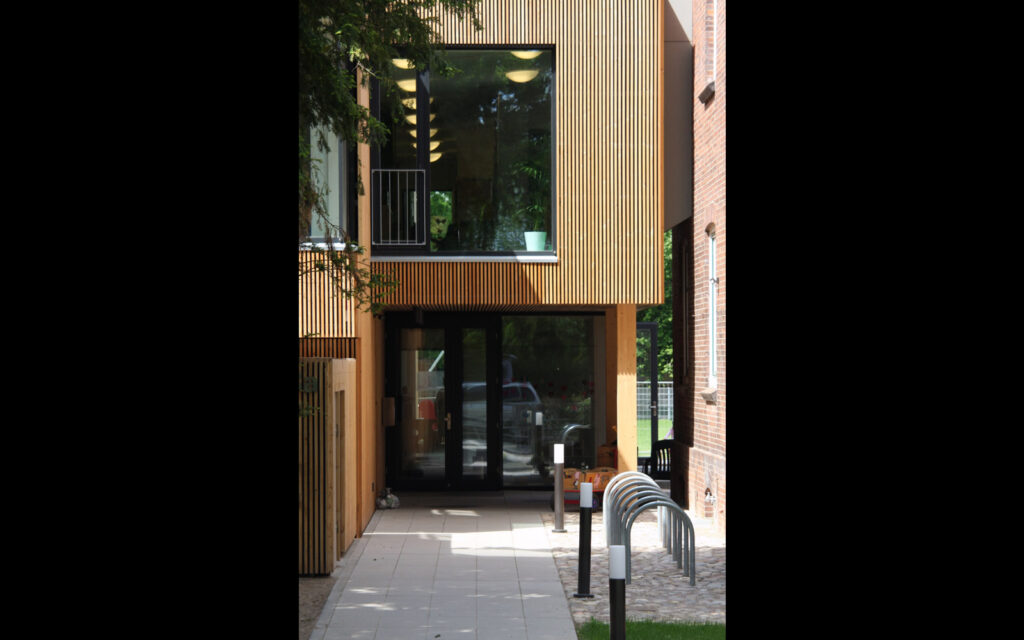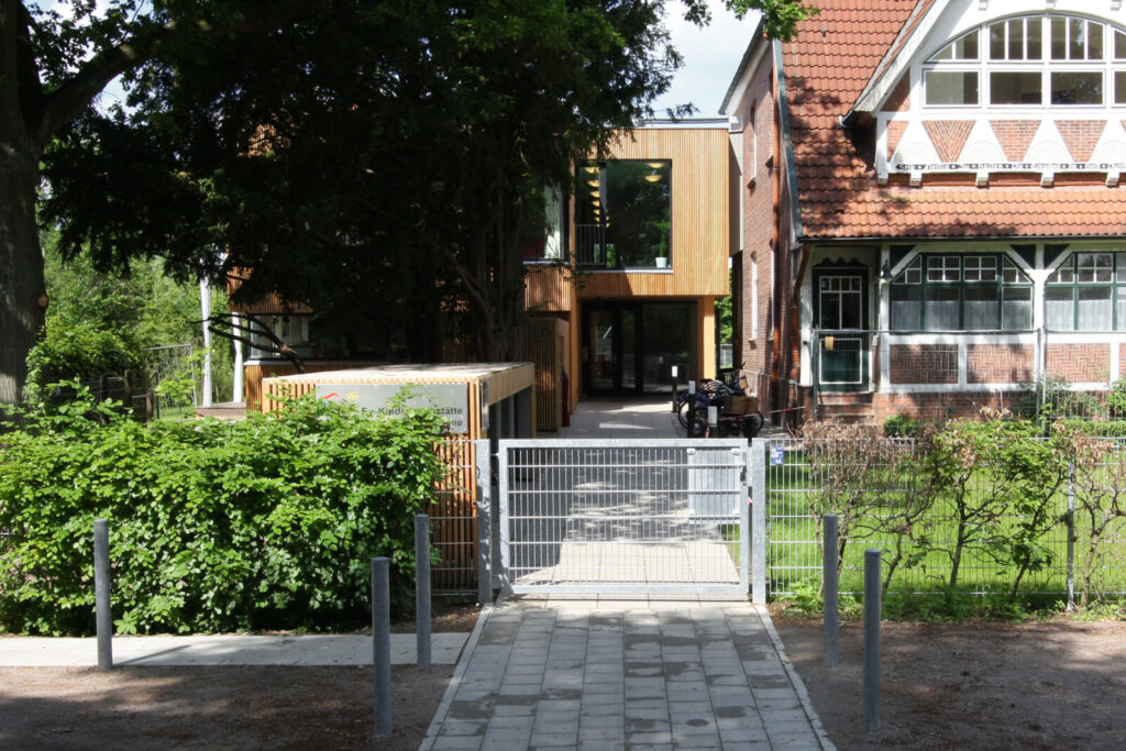 Der Kindergarten war bisher im historischen Gemeindehaus untergebracht. Dort reichte der Raum nicht mehr aus. Im direkten Anschluss an den Altbau nimmt die Kindergarten-Erweiterung nun den Platz ein, den in den Vierlanden ansonsten Schuppen neben Haupthäusern haben. Von der Straße aus gesehen steht der Holz-Neubau im Hintergrund. Seine zurückhaltende Position setzt sich in seiner Gestaltung fort.