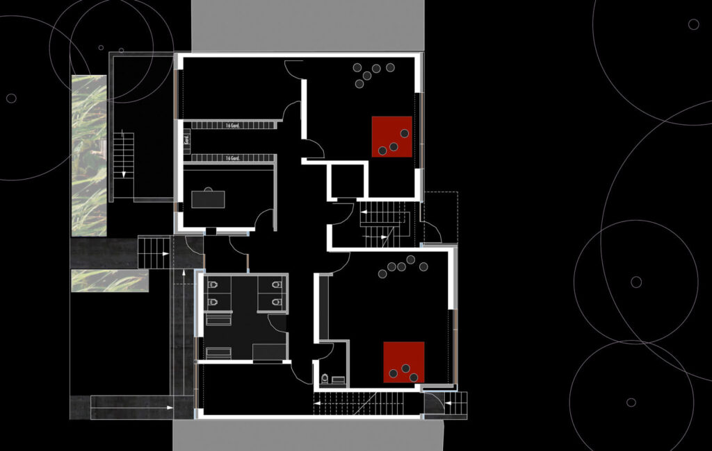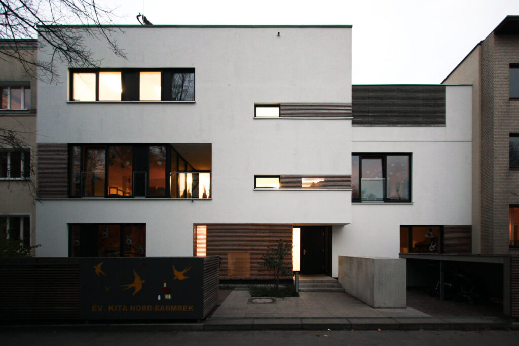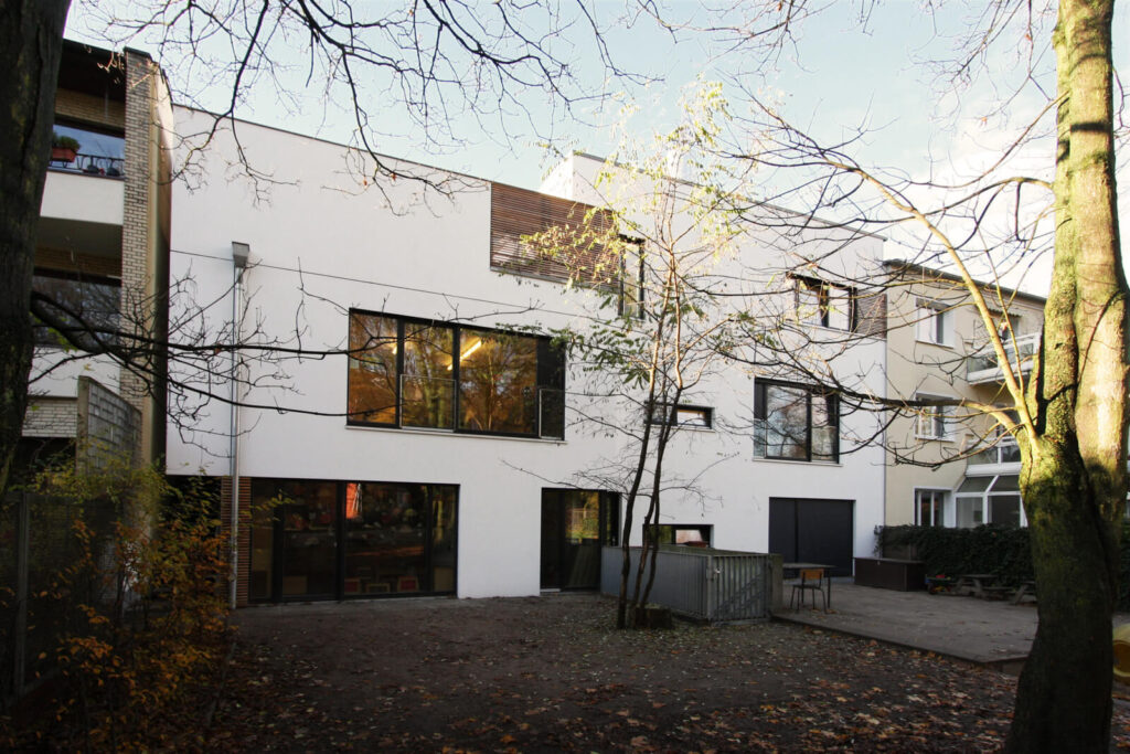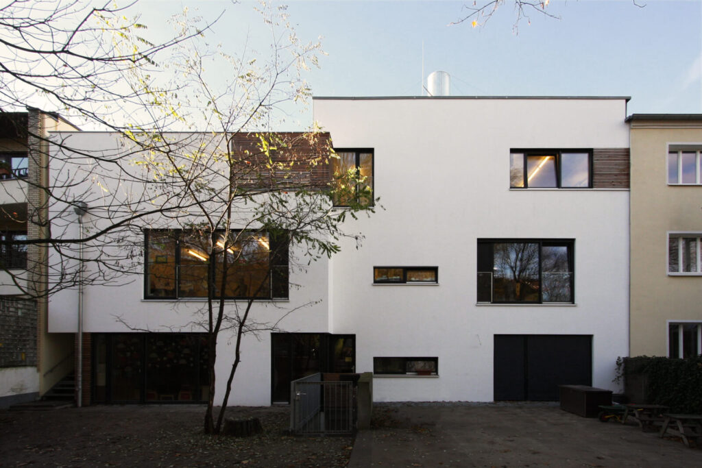 Nach Abbruch zweier nebeneinander stehender Häuser in der 3- bis 4-stöckig bebauten Wohnstraße war die Baulücke mit einem zusammenhängenden Kita-Gebäude zu schließen. In der Baukörpergliederung zeichnet der Entwurf die kleinteilige Parzellierung des Ortes nach. Die Außenspielflächen sind im Garten und auf einer Dachterrasse angeordnet. Beide verbindet eine Treppe, die in einen Einschnitt der Bauplastik eingefügt ist.
