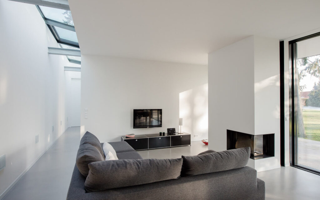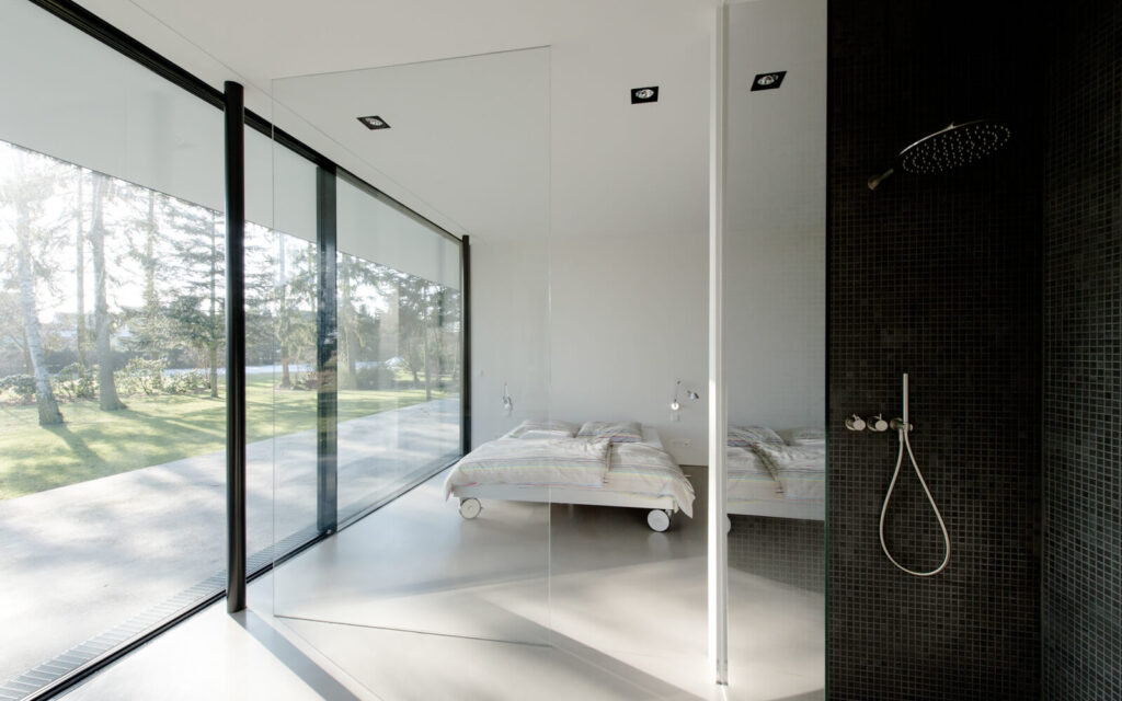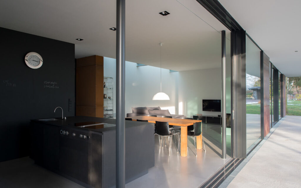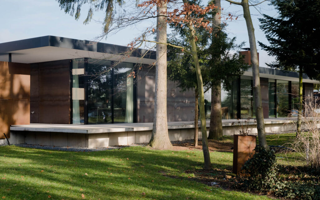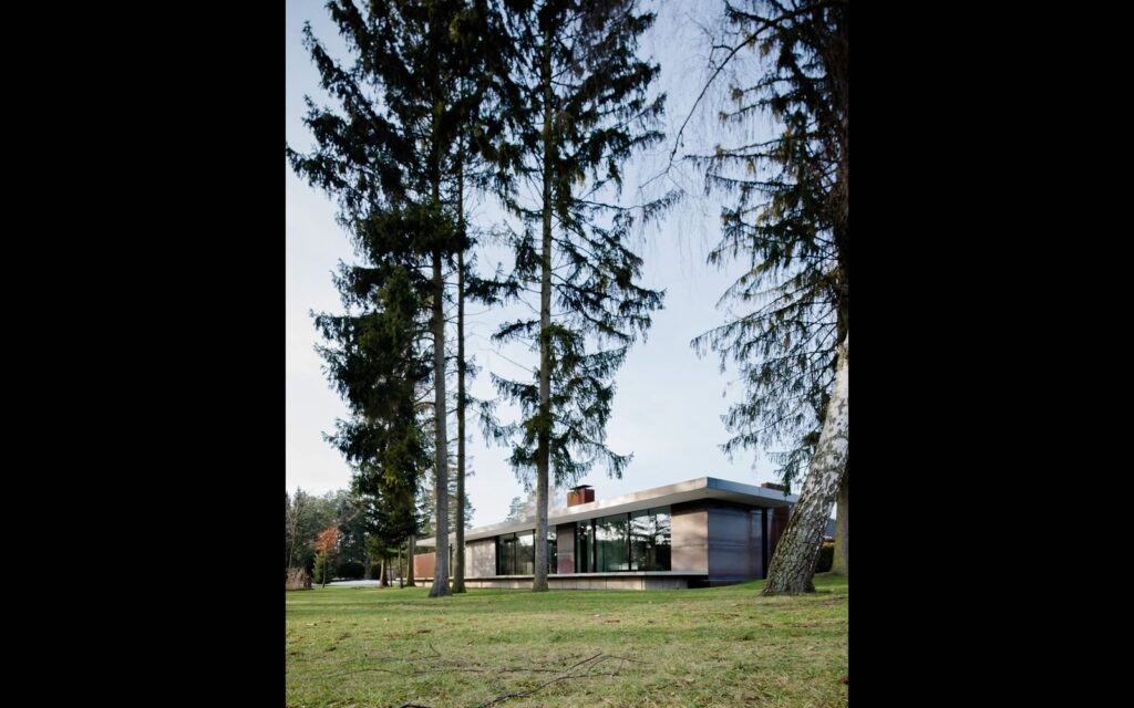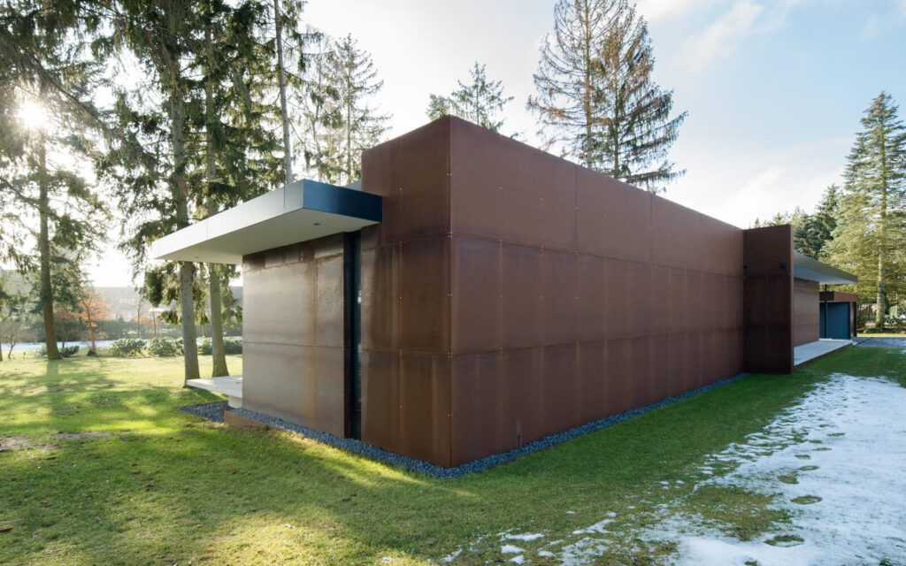 Hier stellte sich die Aufgabe, ein Wohnhaus in einen weitläufigen, parkartigen, mit alten Kiefern bestandenen Garten zu planen. Auf der Rückseite schließt das Firmengelände des Bauherrn an. Case studies der 1940er und 50er Jahre waren dann Vorbild für den Entwurf. Der Bau hat eine geschlossene Seite zur Firma und öffnet sich zum Garten – holt den Garten gleichsam ins Haus hinein. Es ist eine Hybridkonstruktion aus Stahl und Holz mit einer Beplankung aus Cortenstahl und feingliedrigen Glas-Schiebeelementen.