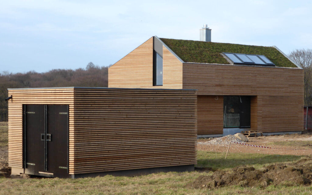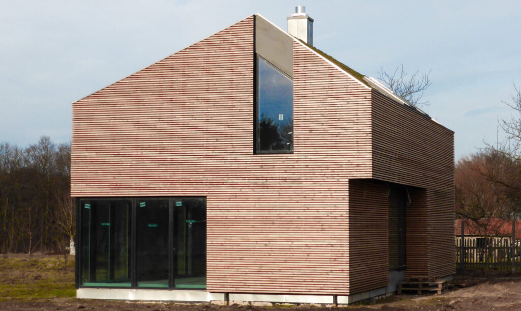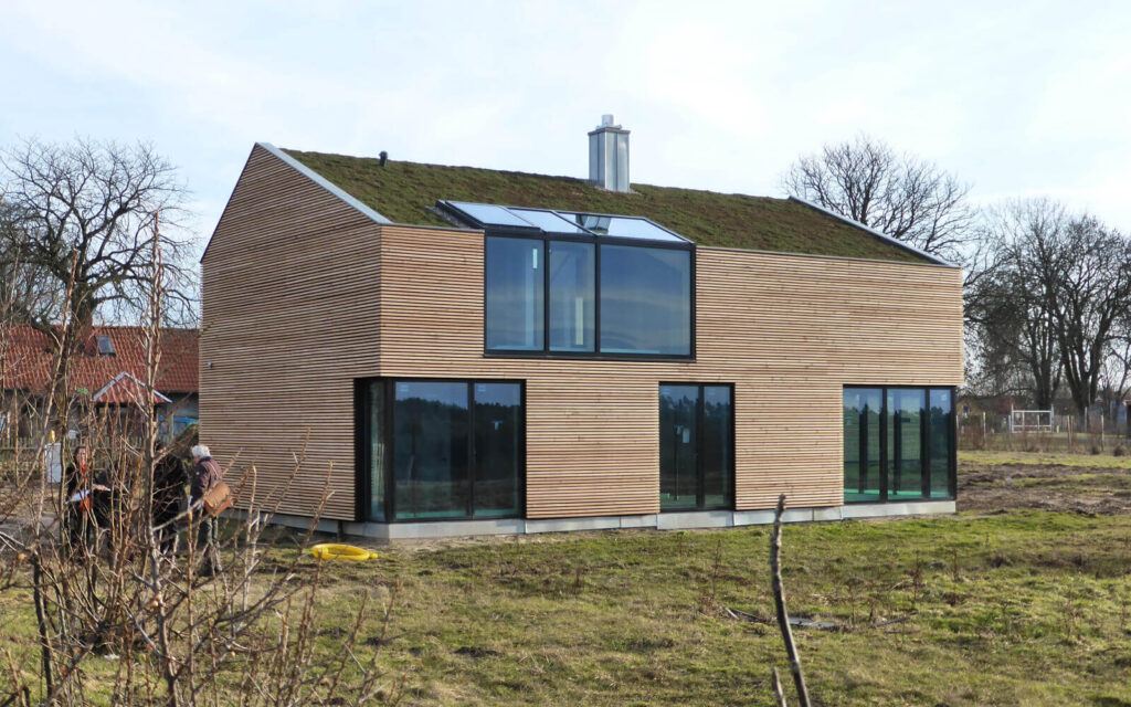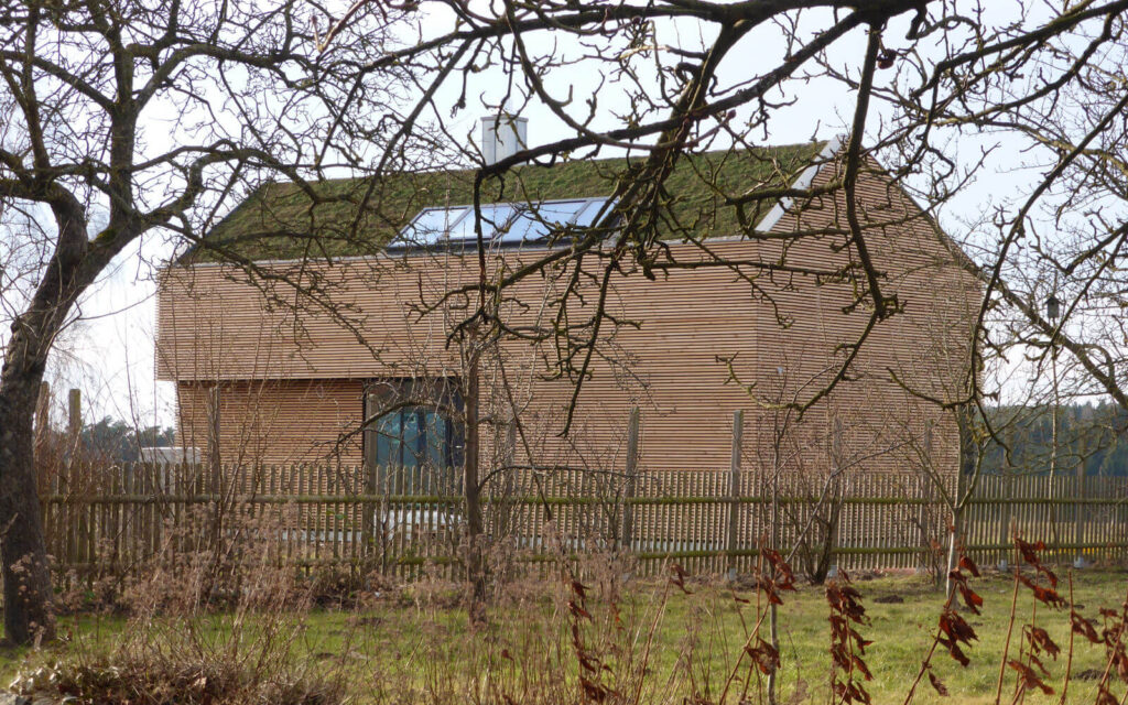 Eingebettet in die Wiesenlandschaft steht dieses Holzhaus am Rande des vorpommerschen Dorfes Pulow nahe Lassan. Seine Außenhaut lässt es zum Teil der Landschaft werden. Im Inneren ist der Bau als split-level organisiert.