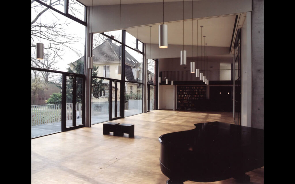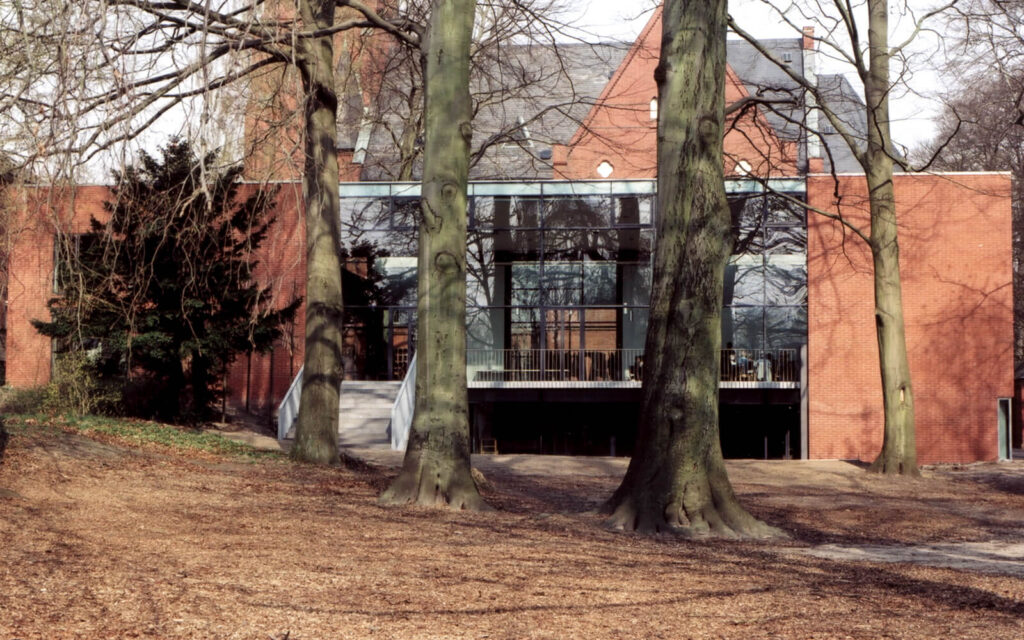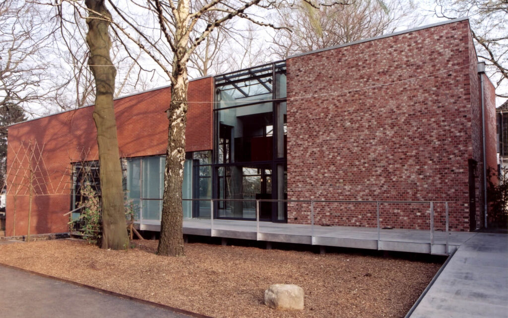 Das Gemeindehaus steht im Kontext eines Backstein-Ensembles aus neugotischem Kirchengebäude und zwei Pastoraten. In seiner Materialität ordnet es sich dem Ort unter, in seiner Gestalt ist es ein eindeutiges Zeugnis der Gegenwart. Auf einem Rechteckgrundriss sind diverse Raumzonen klar und funktional angeordnet. Differenziertes Licht, z.T. indirekt über Obergaden geführt, prägt den Raumeindruck. Die in großen Teilen geöffnete Fassade bezieht den Außenraum in das Gebäudeinnere ein.