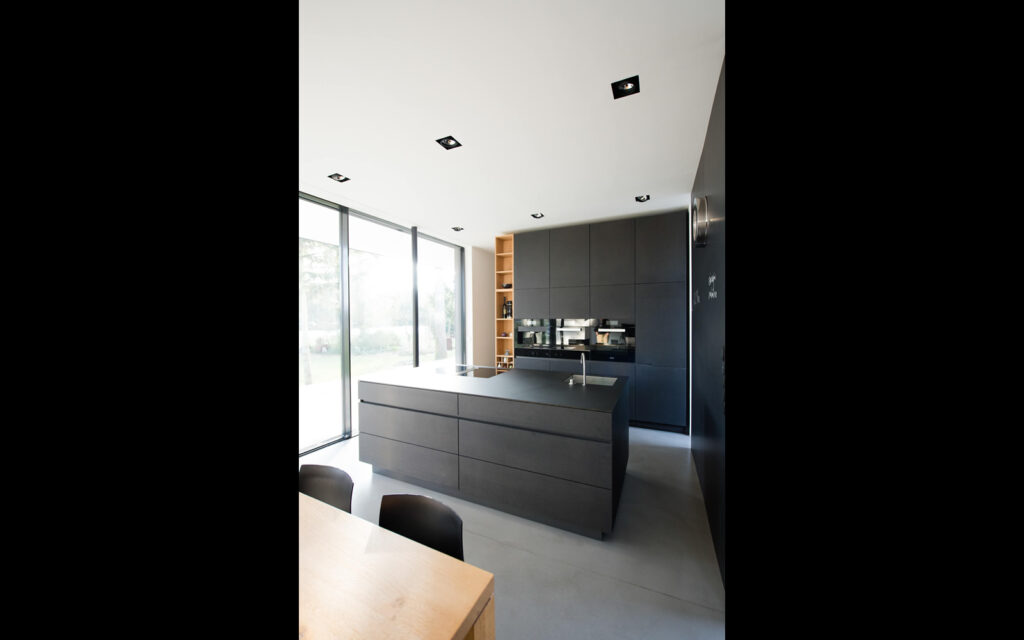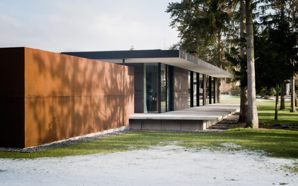 Hier stellte sich die Aufgabe, ein Wohnhaus in einen weitläufigen, parkartigen, mit alten Kiefern bestandenen Garten zu planen. Auf der Rückseite schließt das Firmengelände des Bauherrn an. Case studies der 1940er und 50er Jahre waren dann Vorbild für den Entwurf. Der Bau hat eine geschlossene Seite zur Firma und öffnet sich zum Garten – holt den Garten gleichsam ins Haus hinein. Es ist eine Hybridkonstruktion aus Stahl und Holz mit einer Beplankung aus Cortenstahl und feingliedrigen Glas-Schiebeelementen.