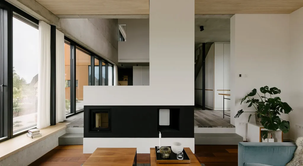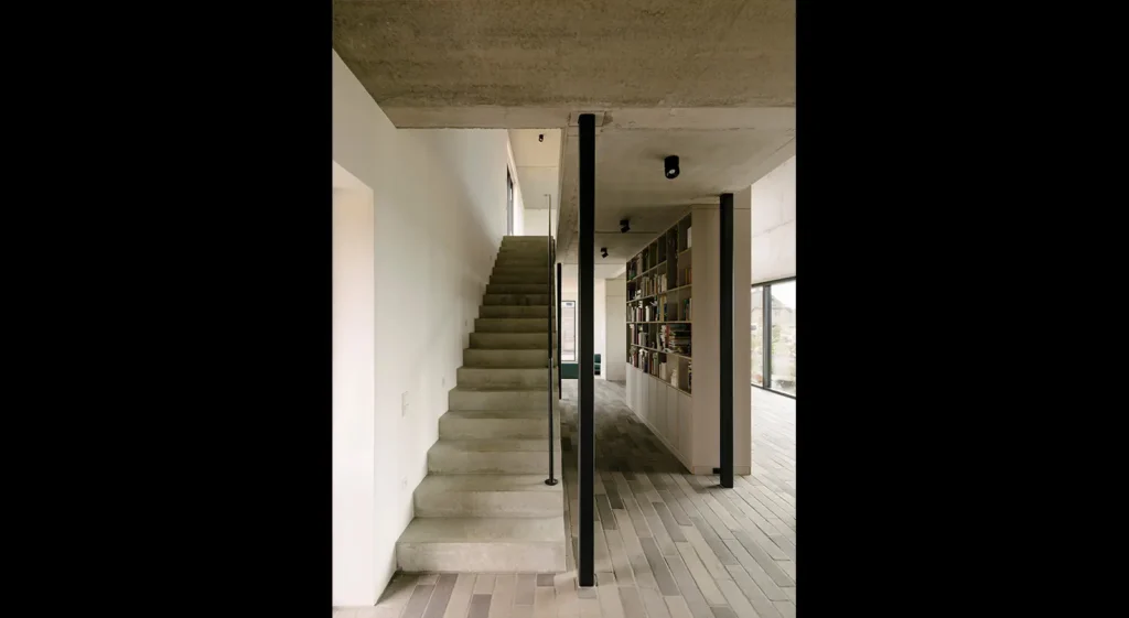 Der Innenraum bietet eine großzügigen Offenheit und eine Vielzahl an Blickbeziehungen. Das Zentrum des Wohnraumes prägt der zweietagige Möbelkörper. Das raumhohe Regal ist bereits von Anfang an Teil der Entwurfsaufgabe. Es ist gleichzeitig ein Ausstellungsbereich, Bibliothek, Archiv und Arbeitsort und verbindendes Element zwischen den Etagen und übernimmt Wandtrennende- als auch Brüstungsfunktionen.
