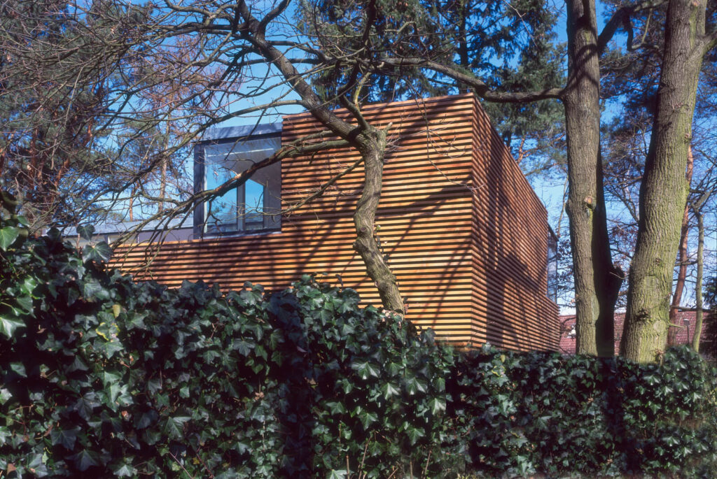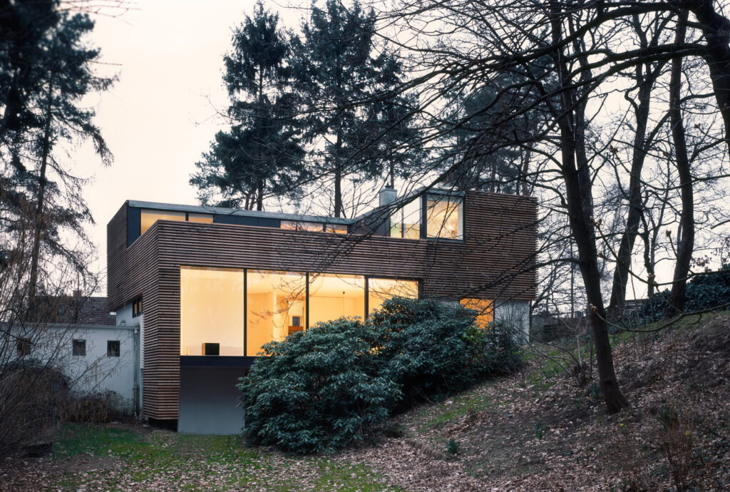 Der Bungalow aus den 1970er Jahren stellte sich als 1-geschossiger Flachdachbau mit breitem schwarzen Dachrand dar und wirkte gegenüber der Nachbarbebauung etwas eingesackt. Die planungsrechtlich mögliche Staffelaufstockung ist so positioniert, dass sich das Haus straßenseitig in voller Zweigeschossigkeit präsentiert. Die Rückstaffelung ist auf die Gartenseite verlegt und ergibt dort eine großzügige Dachterrasse.